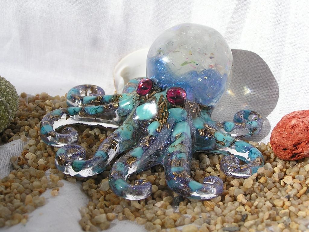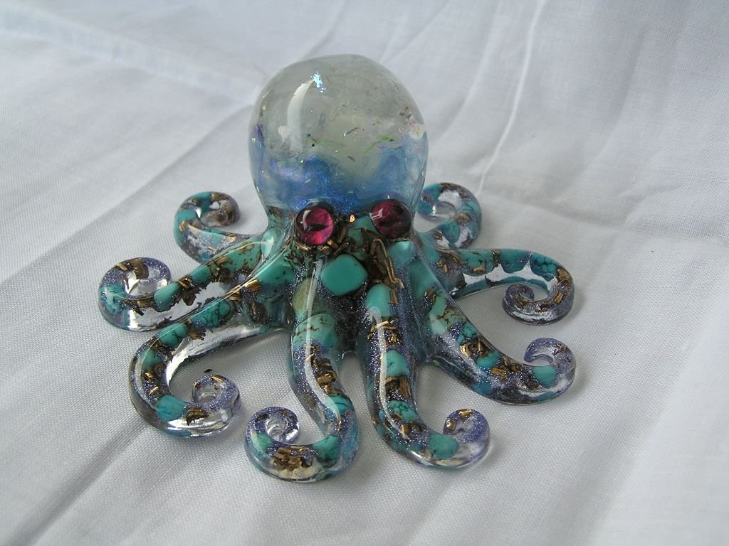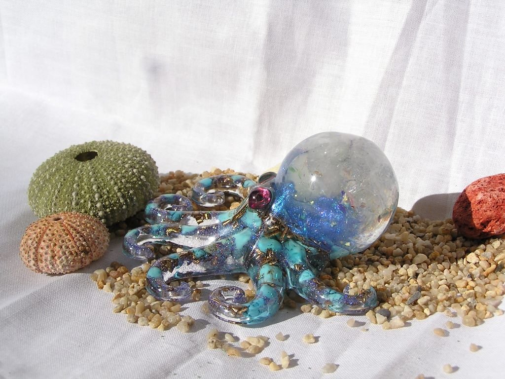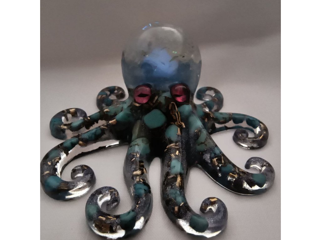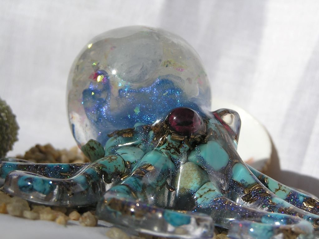 Dekorační orgonit ve tvaru chobotnice spojuje očistnou sílu Křišťálu a uklidňující energii Tyrkenitu.