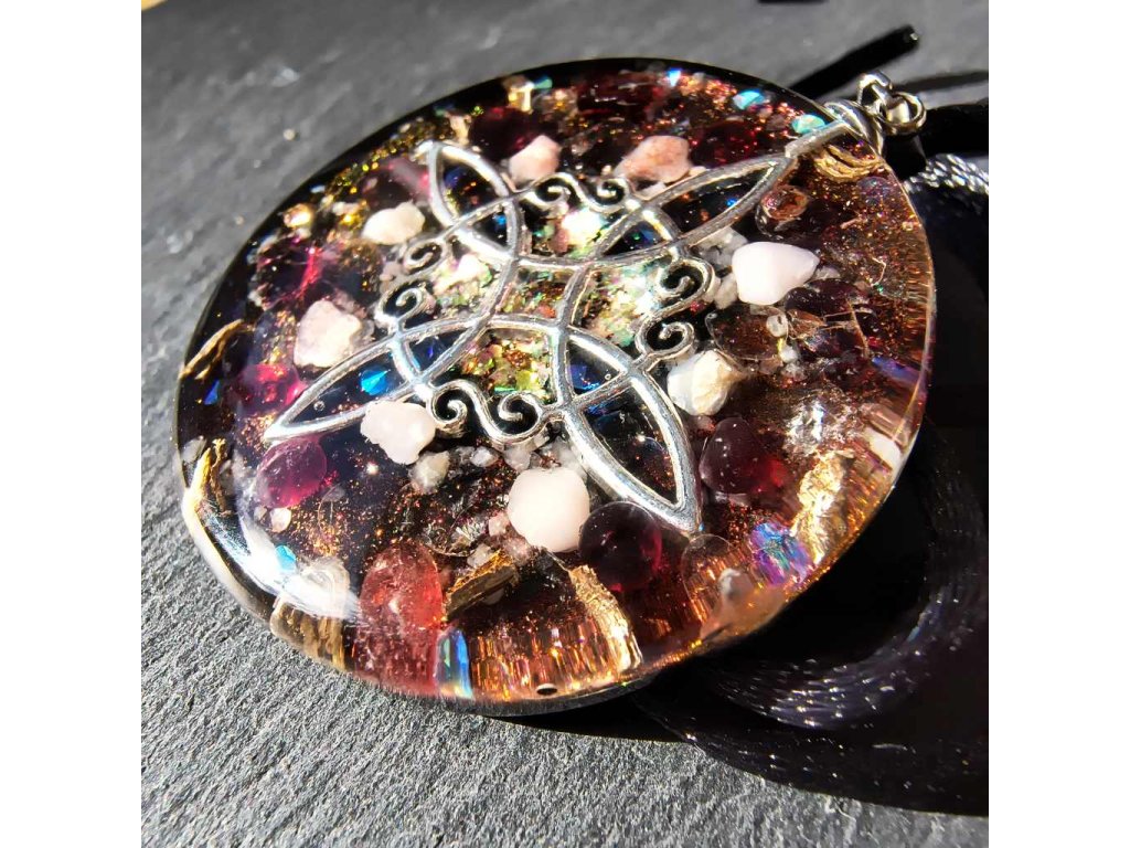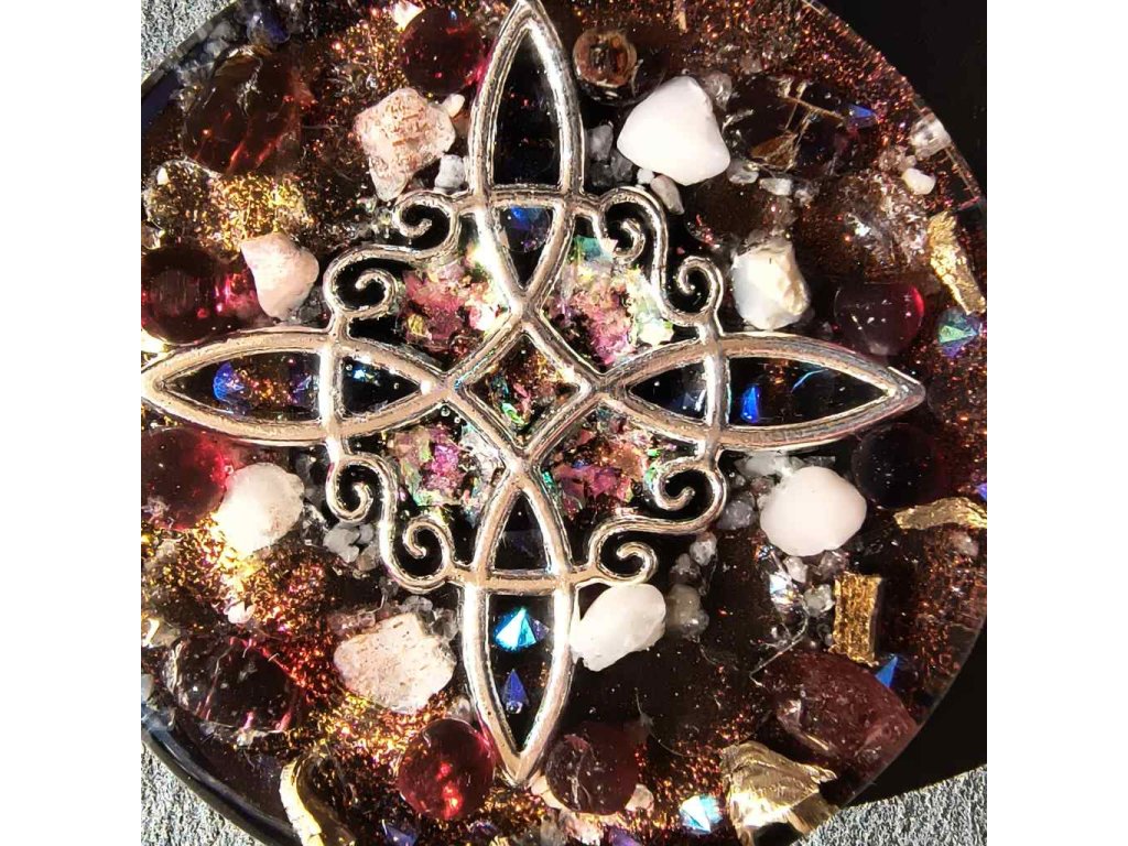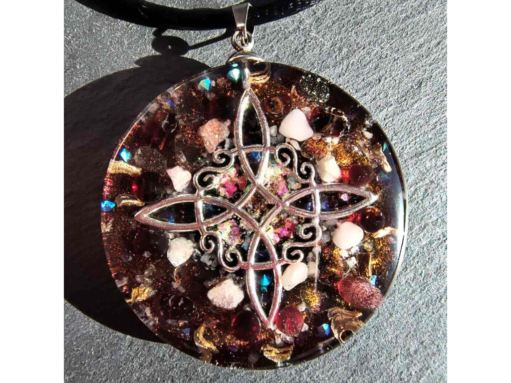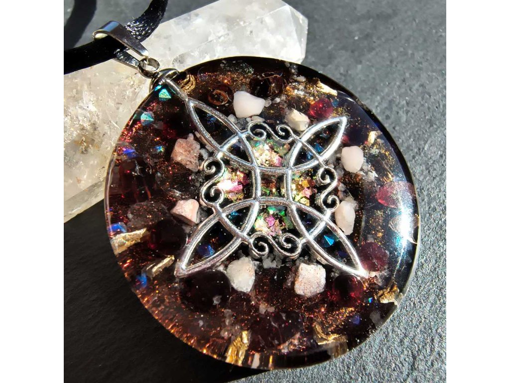 Ručně vyráběný orgonitový přívěsek se symbolem čarodějnického/keltského uzlu.