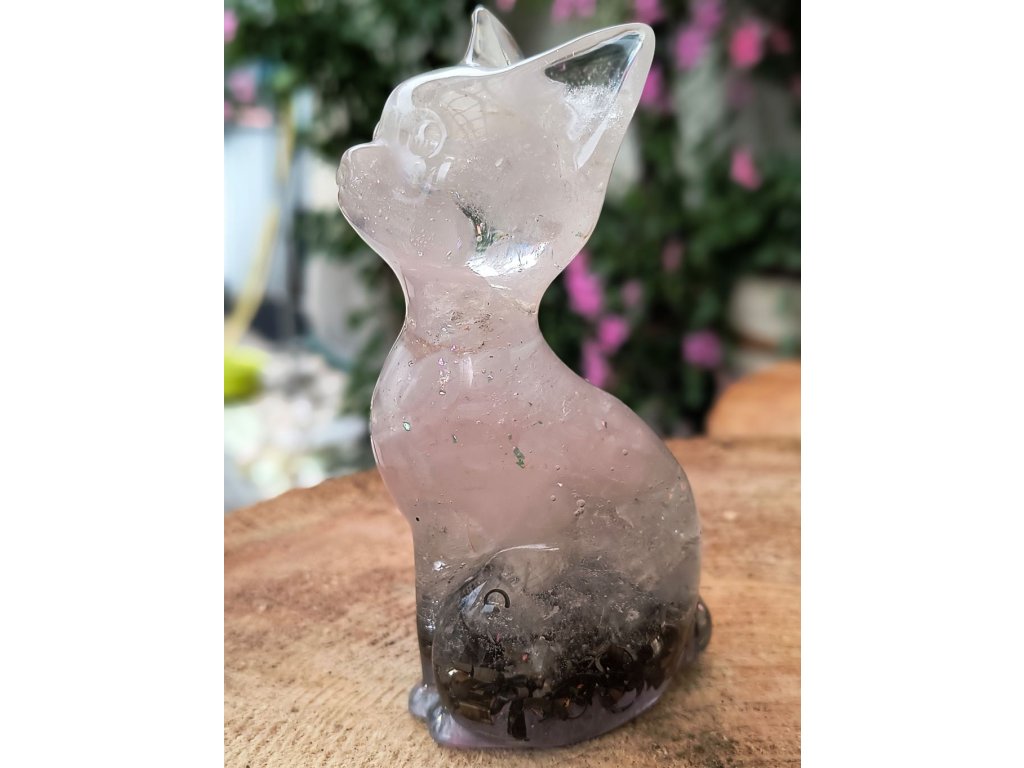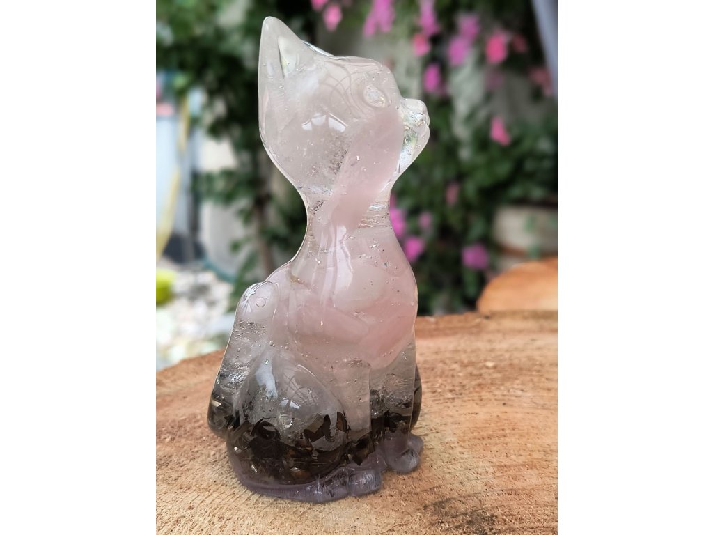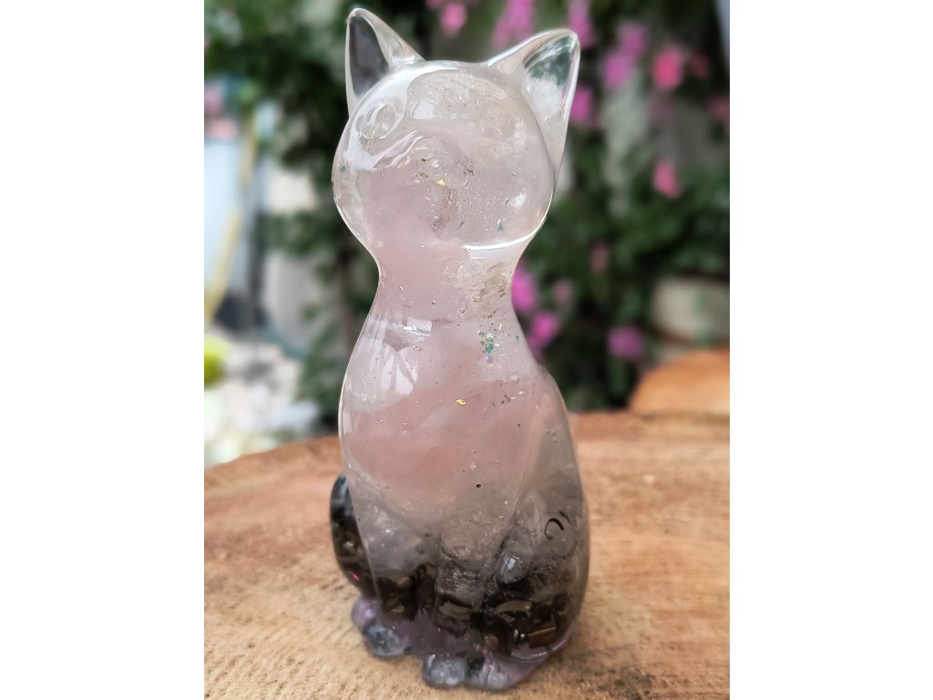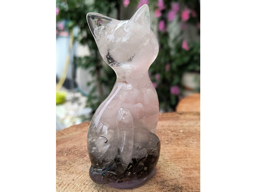 Orgonit ve tvaru kočky s růženínem a křišťálem. Podporuje lásku, klid a harmonii v prostoru, zároveň chrání domov jemnou energií.