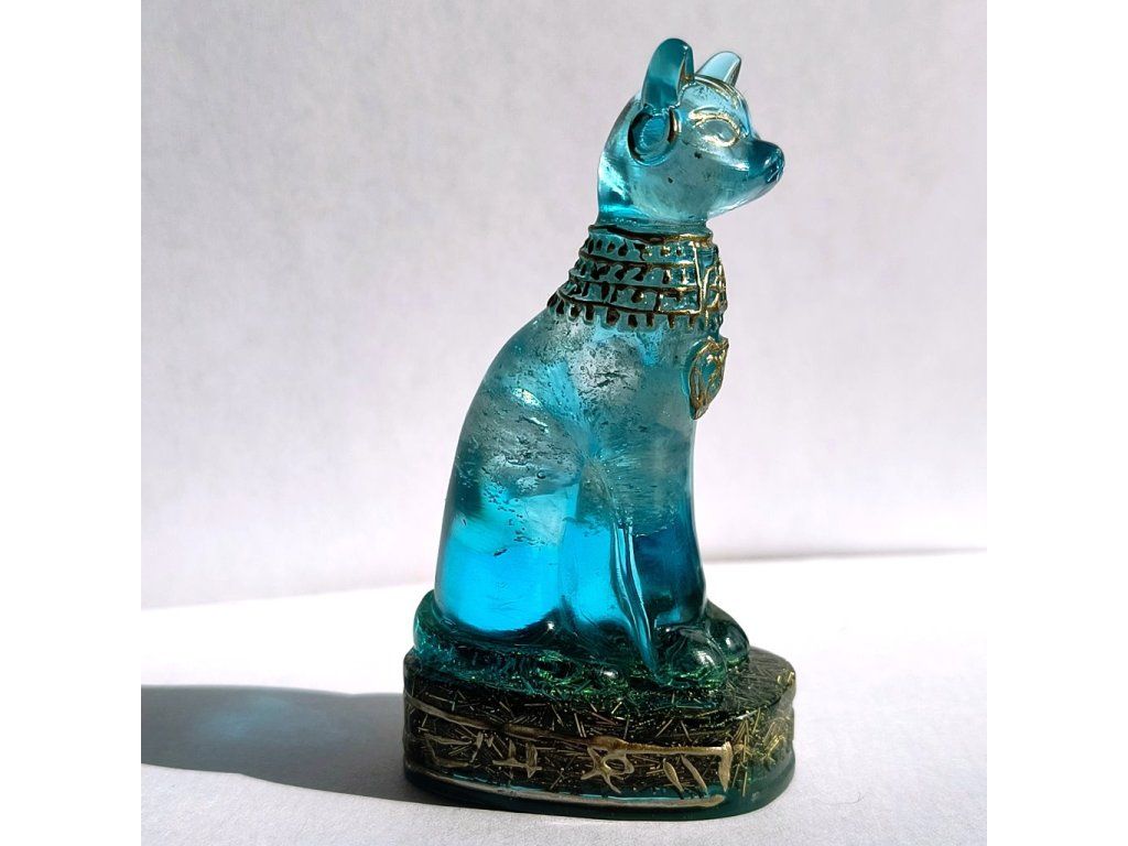 Unikátní orgonitová soška bohyně Bastet v netradičním odstínu nilské vody. Na rozdíl od běžných černých vyobrazení působí tato "Nilská Bastet" jemněji a přináší energii rodinné pohody. Uvnitř ukrývá Křišťál a mosaz pro harmonizaci prostoru. Detaily jsou zvýrazněny linkou ve zlatém tónu. Český autorský originál. Cena bez dopravy