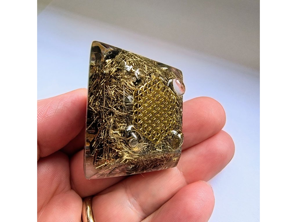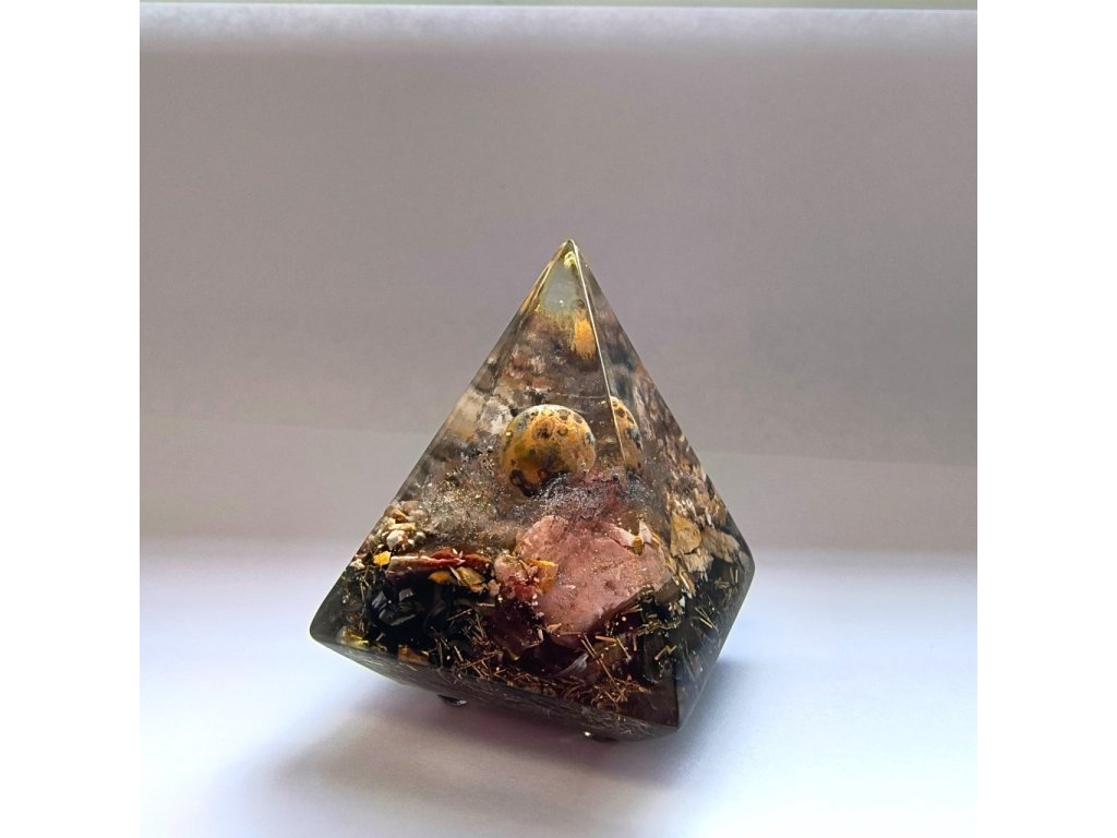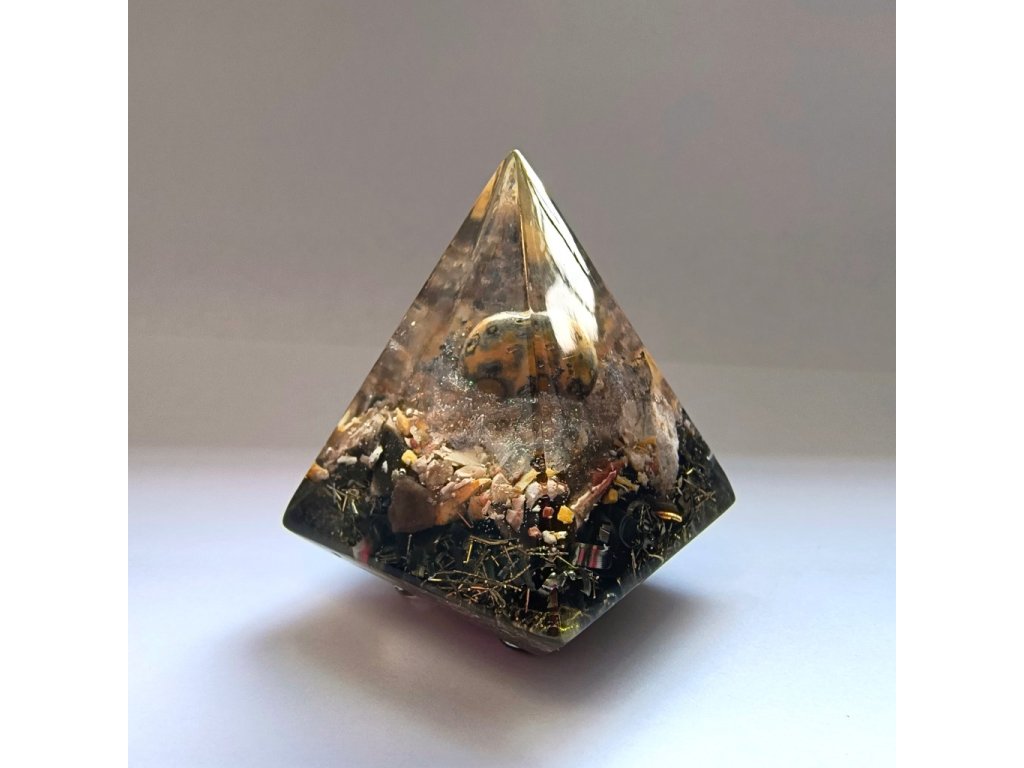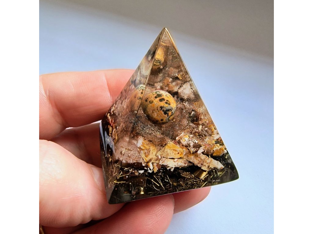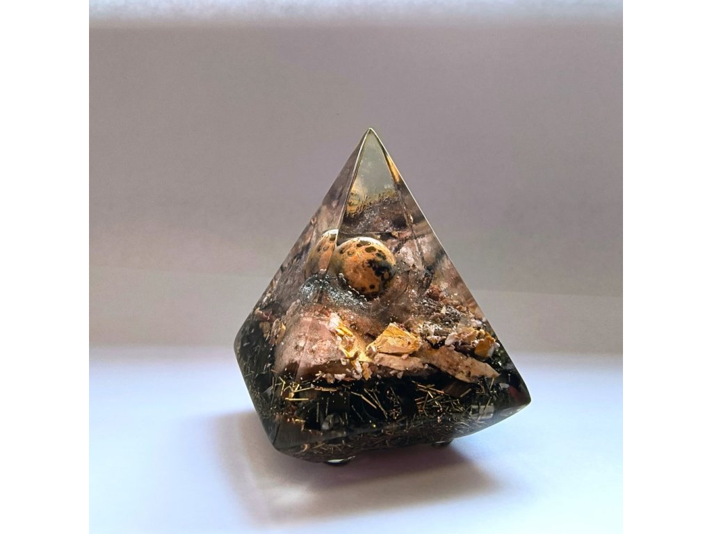Kompaktní orgonitový strážce pro váš osobní prostor. Tato menší pyramida (základna 4x4 cm) v sobě ukrývá sílu Leopardího jaspisu a Jaspisu Zebra. Je ideální na pracovní stůl nebo noční stolek, kde funguje jako štít proti stresu. Na spodní straně nese posvátný energetický symbol. Stojí na drobných nožkách, které jí dodávají lehkost. Ruční česká výroba.