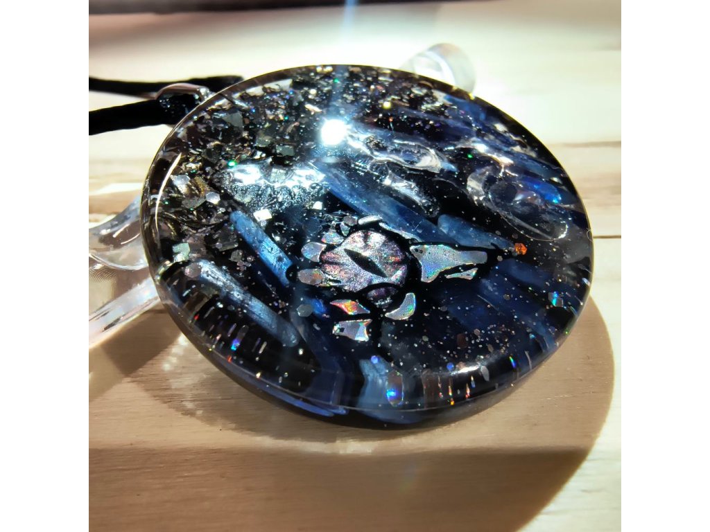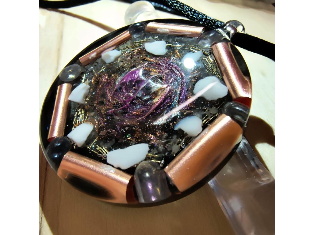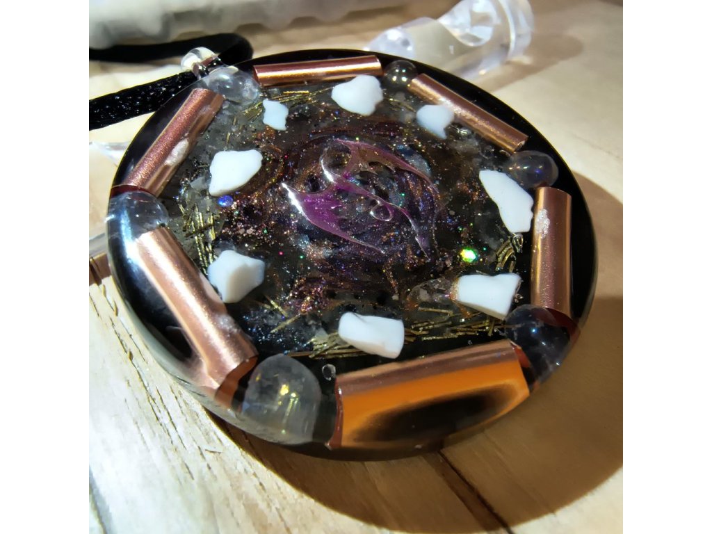 Tento originální orgonitový přívěsek v sobě nese sílu legend a mystiky. Jeho střed zdobí symbol draka, pradávného ochránce a nositele odvahy, síly a transformační energie.