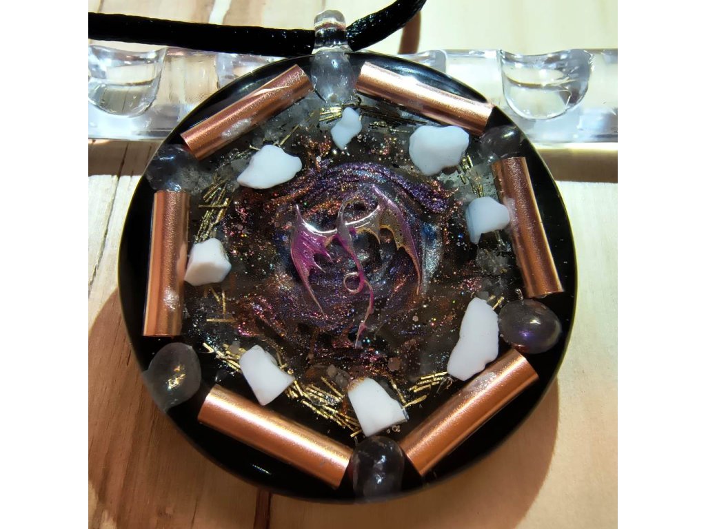 Ručně vyráběné orgonitové přívěsky se symbolem draka. Každý talisman je jedinečný díky kombinaci minerálů a dekorativních prvků. Součástí je zavěšení na šňůrce.