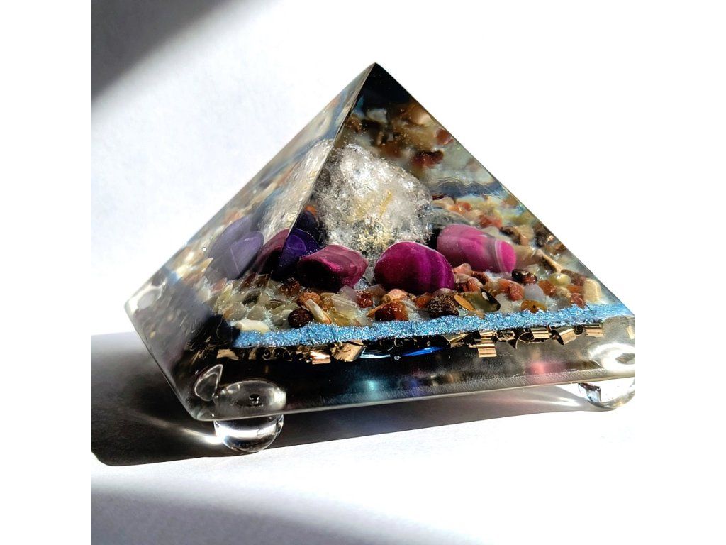 Dominantní orgonit se širší základnou pro stabilitu a silné působení. Tyto velké pyramidy (cca 9 cm) jsou díky své velikosti ideální jako centrální bod (kotva) pro obývací pokoje či kanceláře, kde se přirozeně stanou srdcem prostoru. Zvolte si variantu minerálu (např. Achát nebo Sodalit) přesně podle toho, co vaše energie nebo domov právě potřebuje. Ruční česká výroba.