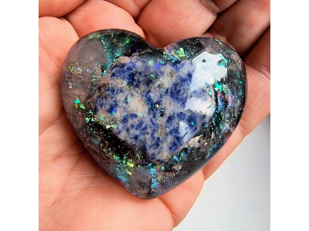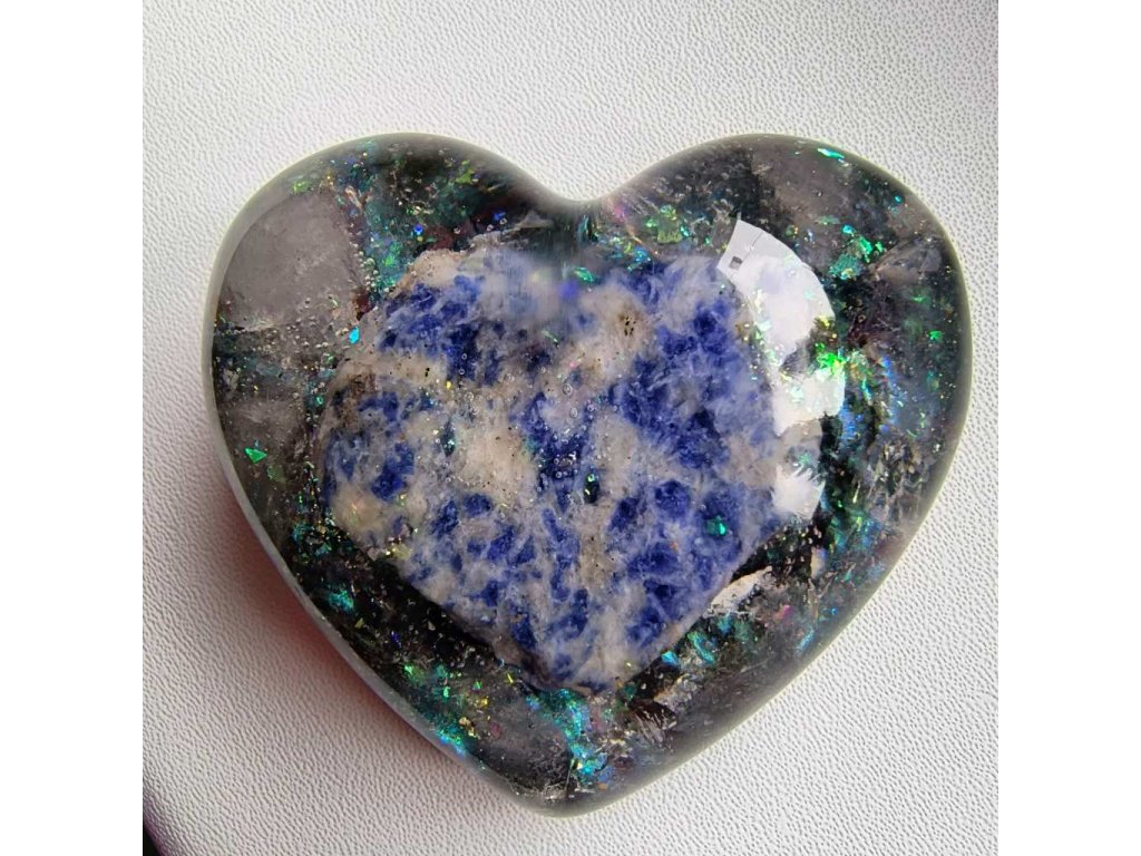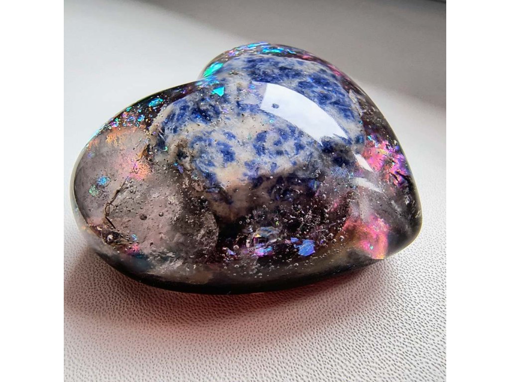 Vzhled: Výrazný modro-bílý kámen tvoří dominantu srdce, obklopený jiskřivou pryskyřicí a křišťály.