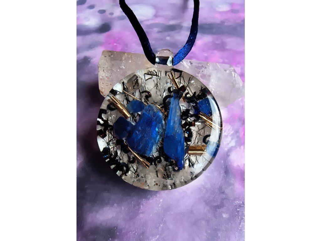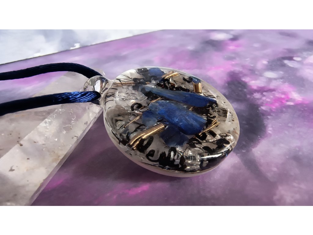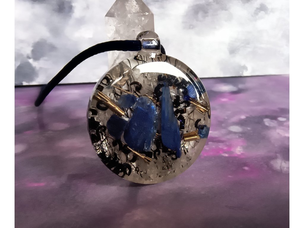 Orgonitový přívěsek s elegantní kombinací minerálů. Obsahuje Kyanit, který podporuje klid, soustředění a komunikaci, a Křišťál pro očistu a ochranu. křemičitý písek.