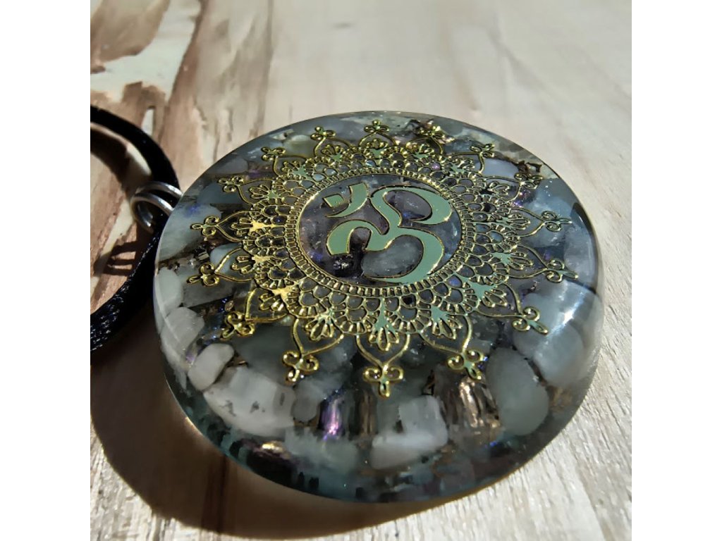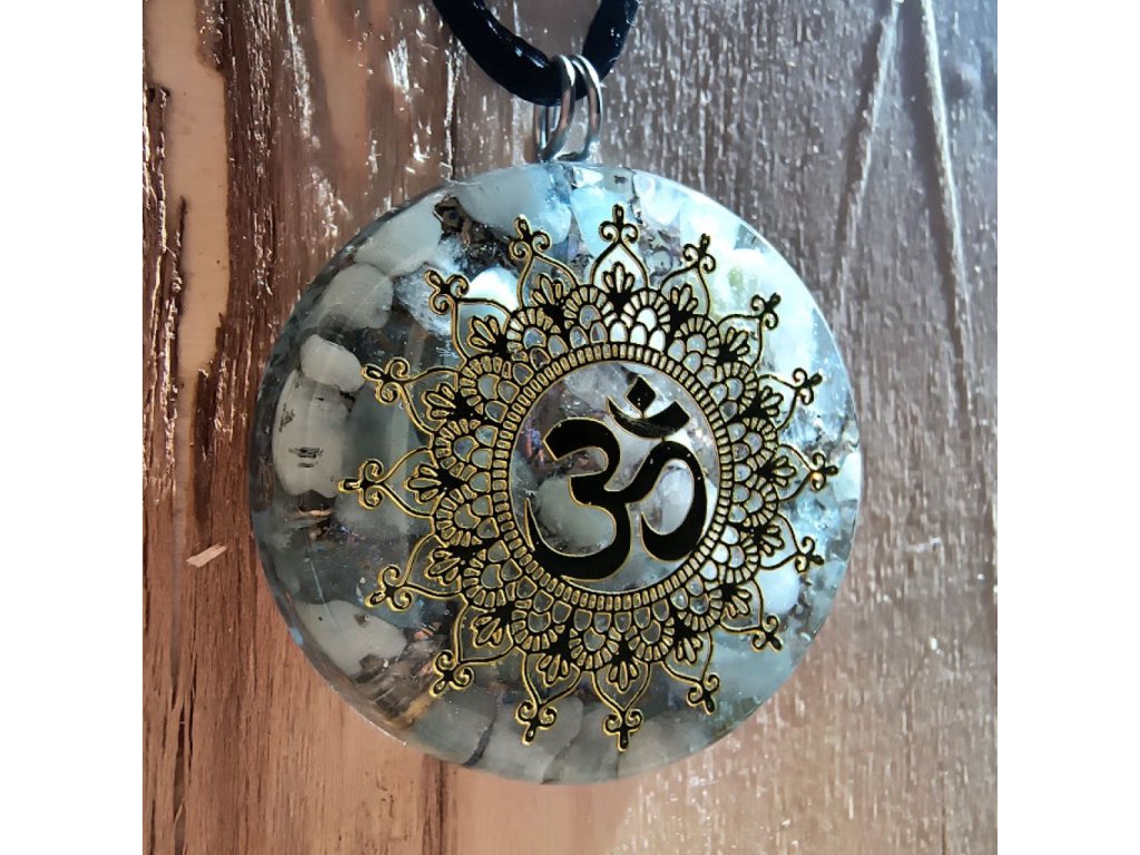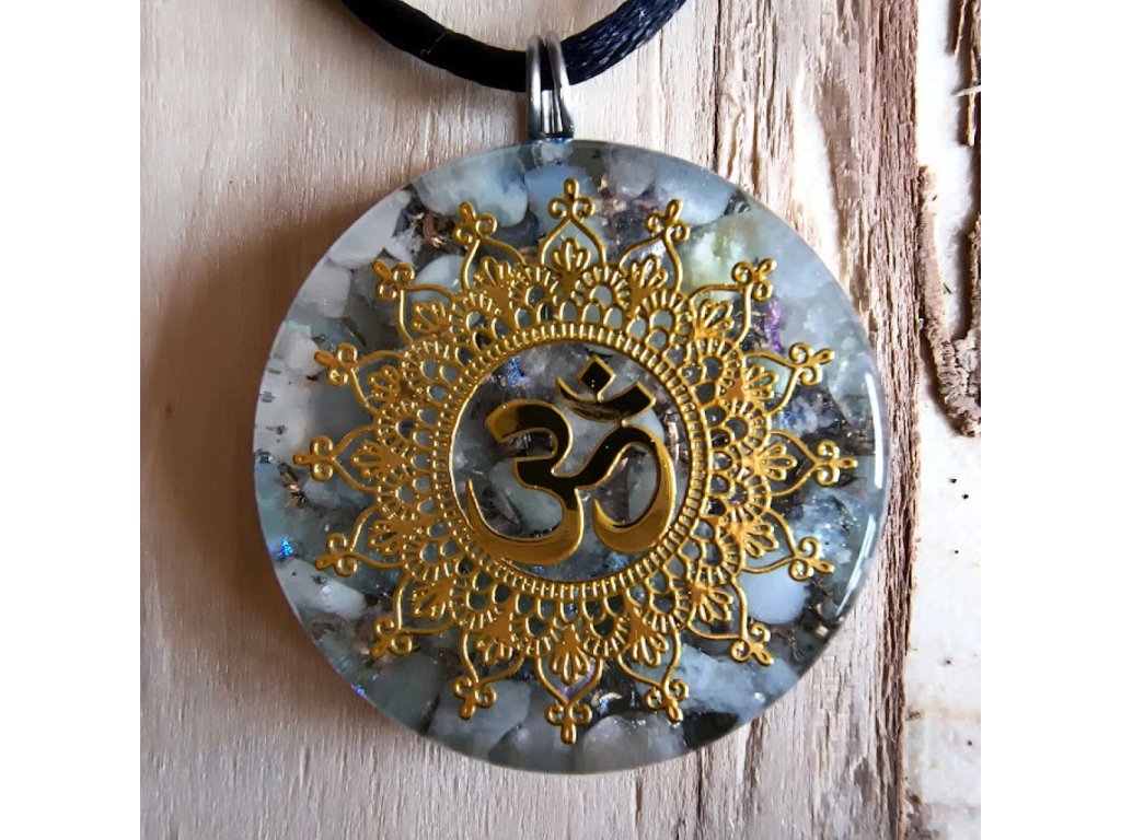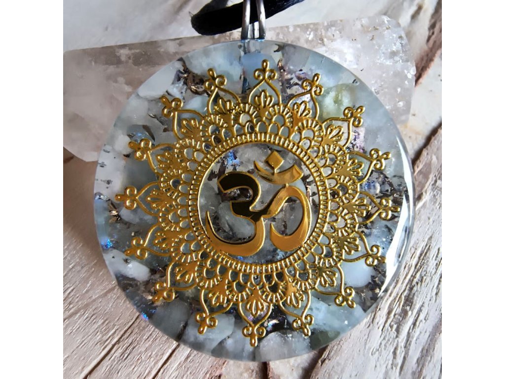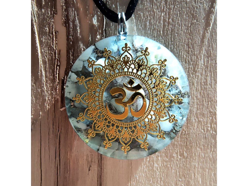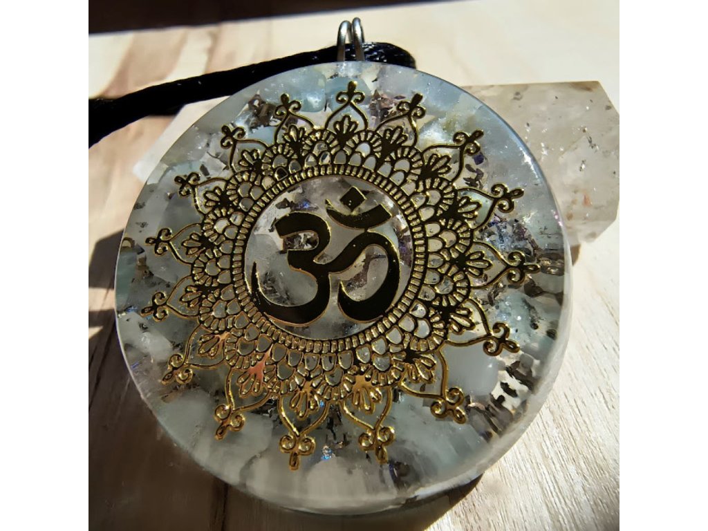 Orgonitový přívěsek s morganitem, křišťálem a zlatým symbolem Óm v jemné mandale. Pro vnitřní klid, sebelásku a harmonii duše.