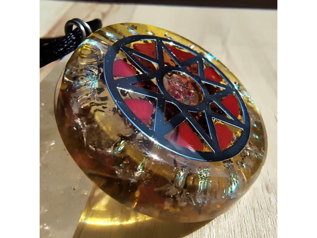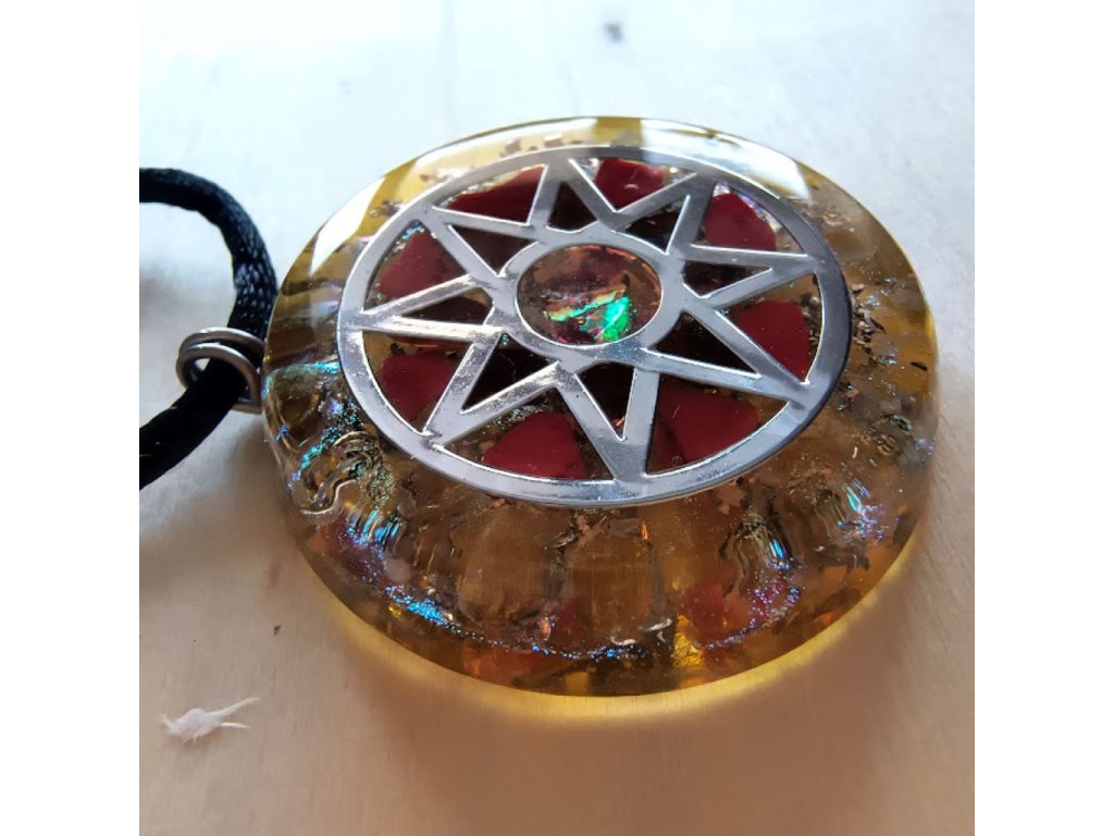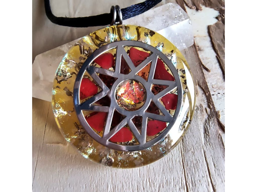 Energie slunce ukrytá v ručně vyrobeném orgonitovém přívěsku s granátem, křišťálem a červeným korálem. Síla vášně, odvahy a životní radosti.