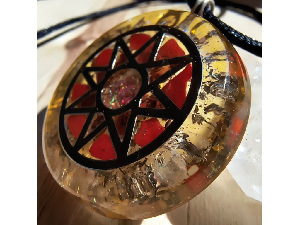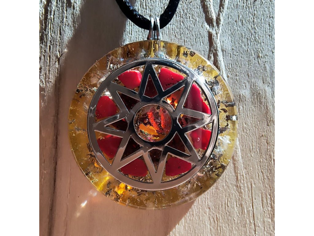 Tento zářivý orgonitový přívěsek je jako malý plamen zavěšený na krku. Kombinuje tři silné minerály – granát, křišťál a červený korál, které jsou zalité do pryskyřice spolu s kovovými hoblinkami a dekorativním symbolem ve tvaru slunce. Výrazná červeno-zlatá barevnost vyniká při dopadu světla a působí jako zářivý amulet energie.