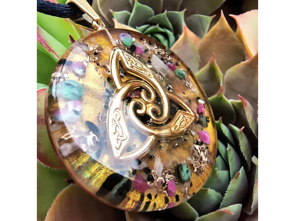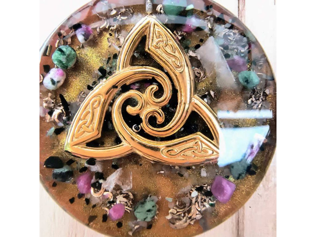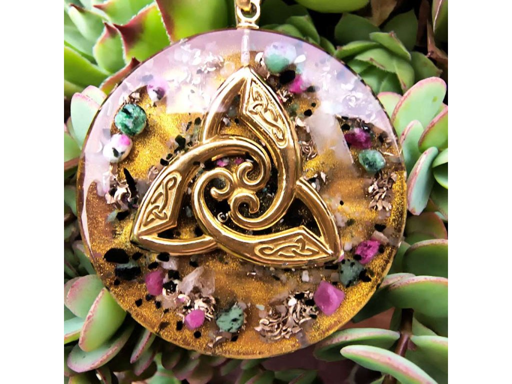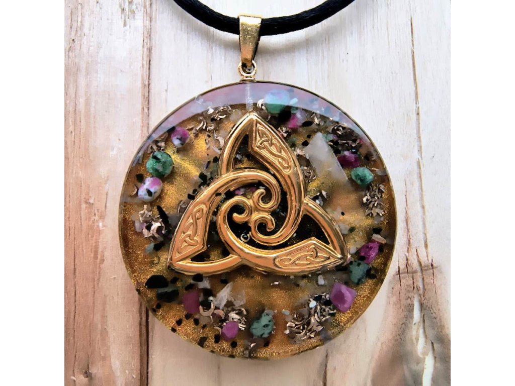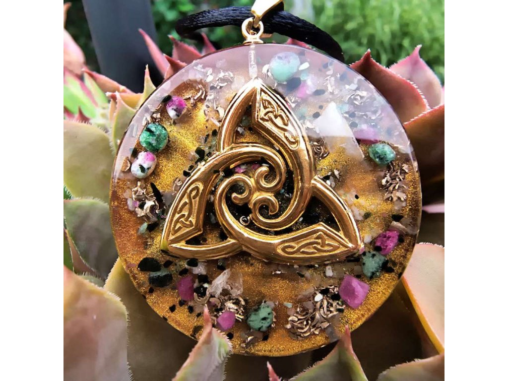 Talisman prastaré trojice je ručně vyráběný orgonitový přívěsek inspirovaný keltským motivem triquetry. V čiré pryskyřici jsou zakomponovány kousky turmalínu (včetně černého) a křišťálové špice, doplněné měděnými spirálkami a bronzovým prachem. Zadní zlatavé pozadí dodává šperku slavnostní vzhled.