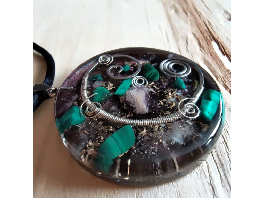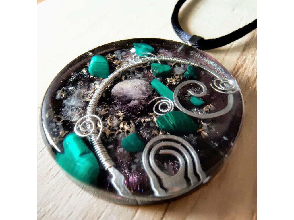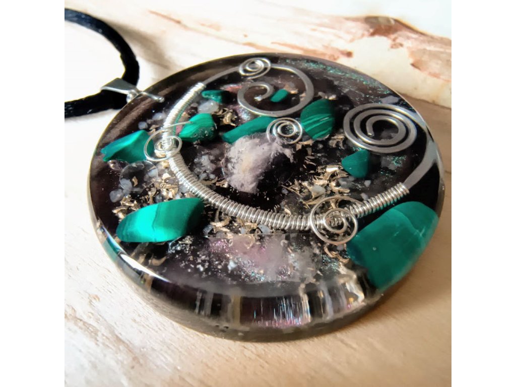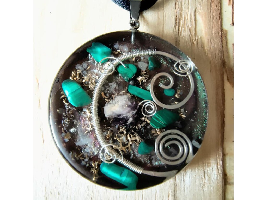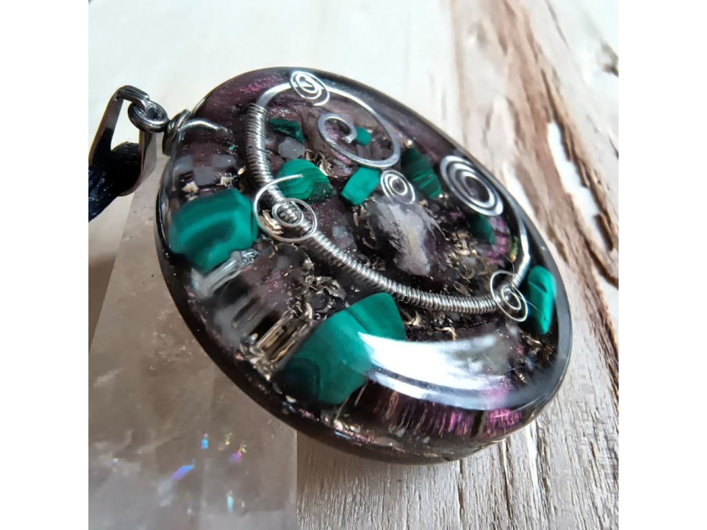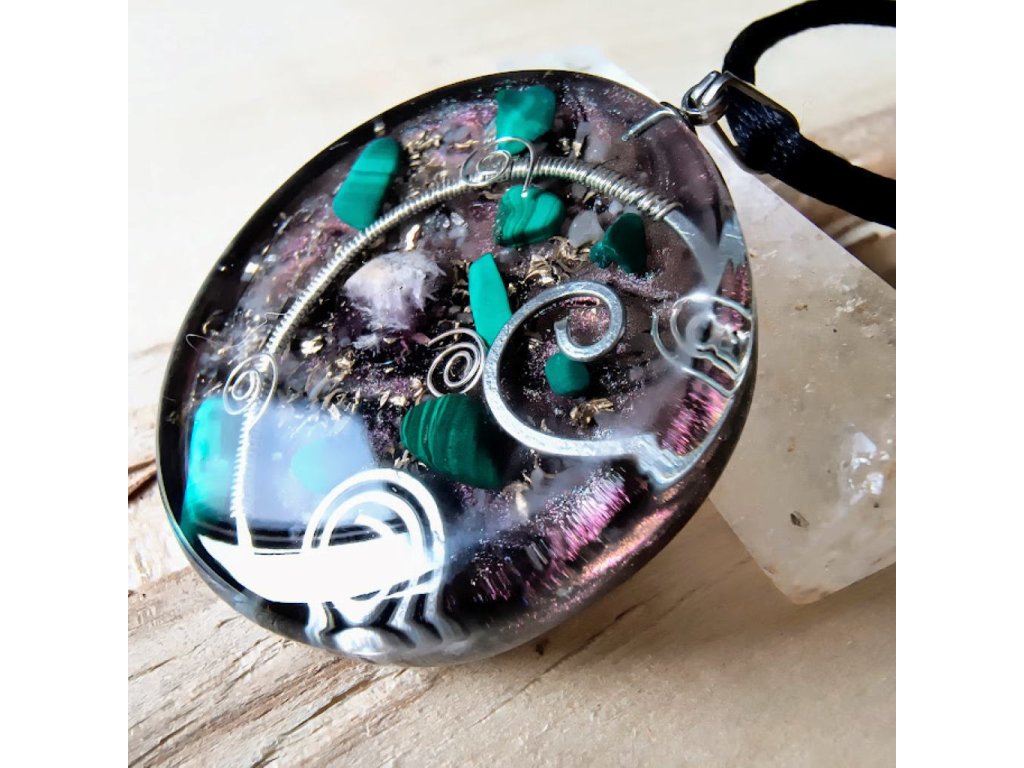 Orgonitový přívěsek s Malachitem, fantomovým Křišťálem a křišťálovou špicí. Alchymie uzdravení, ochrany a hluboké transformace.