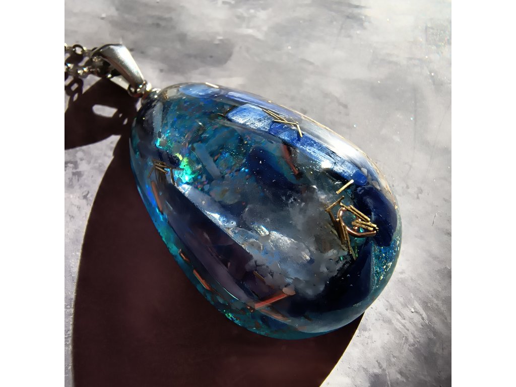 Originální orgonitový přívěsek v jehož středu se nachází Křišťálová špice, známá svými schopnostmi zesilovat energii a čistit prostor. Obklopuje ji modrý Kyanit, jenž dodává harmonii a podporuje vyváženou komunikaci.