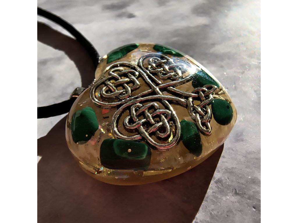 Bronzové hoblinky a měděná spirála na zadní straně přívěsku posilují orgonitové vlastnosti a zajišťují vyvážený tok energie.