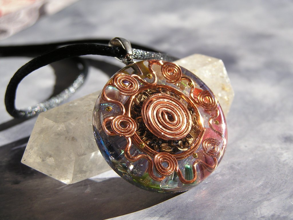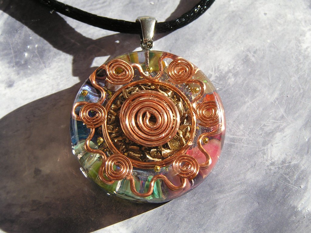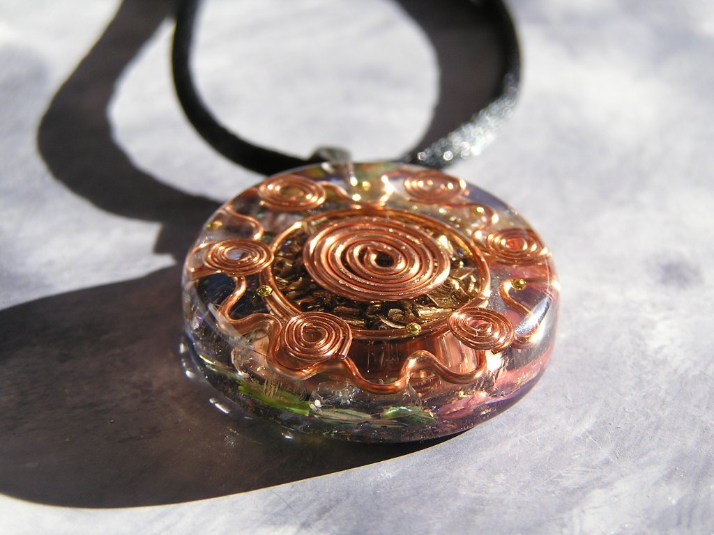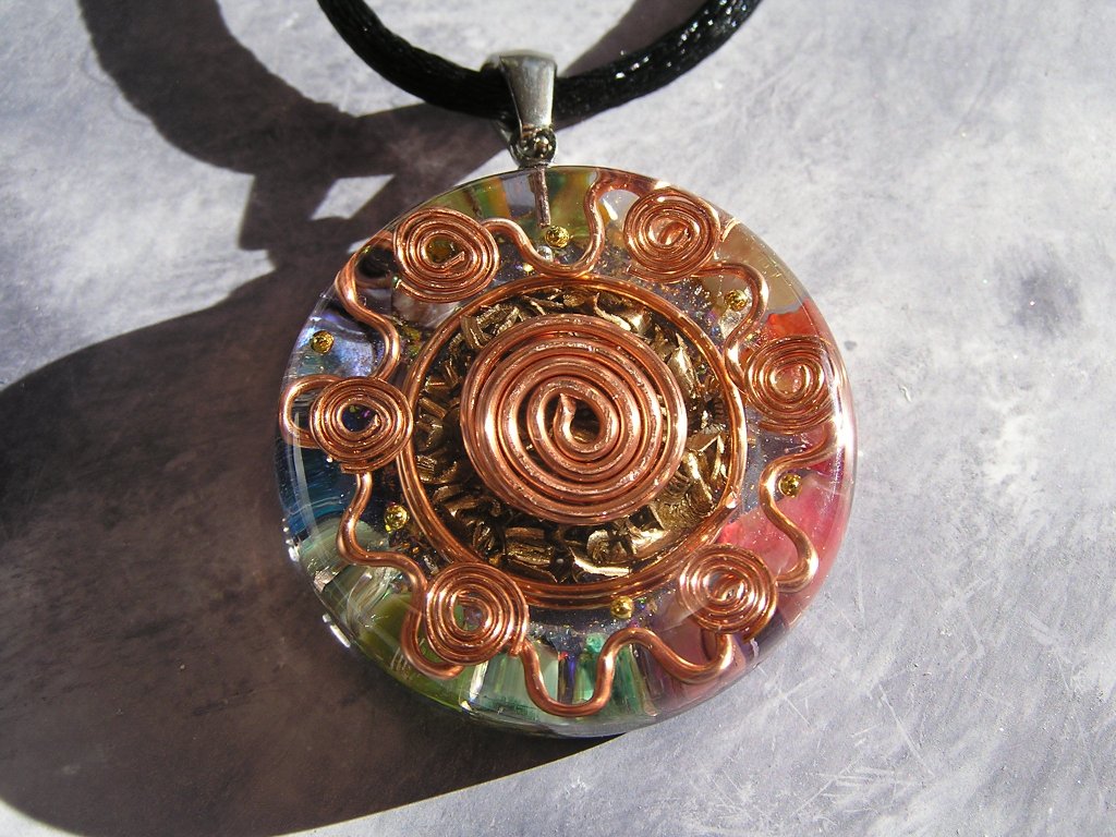 Přívěsek dále zdobí ručně vinuté měděné spirály, které symbolizují tok energie a posilují ochranné vlastnosti orgonitu. Uprostřed je vložen dvojitý měděný kroužek, v němž je zalitý bronzový prach nad kterým je další měděná spirála.Mezi spirálkami jsou drobounké kovové kuličky a vše objímá vlnovka rovněž z měděného drátku.