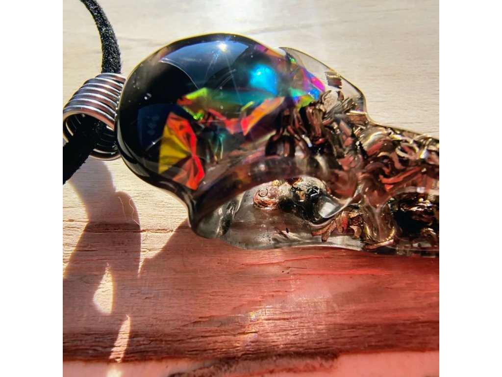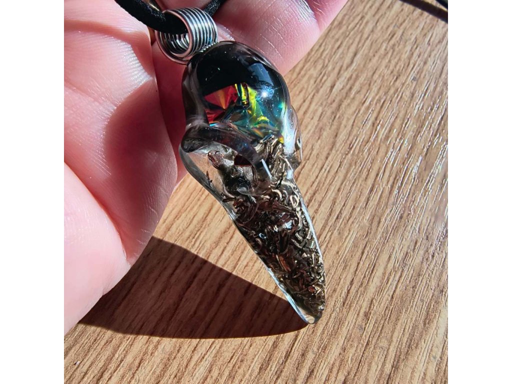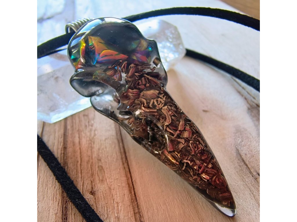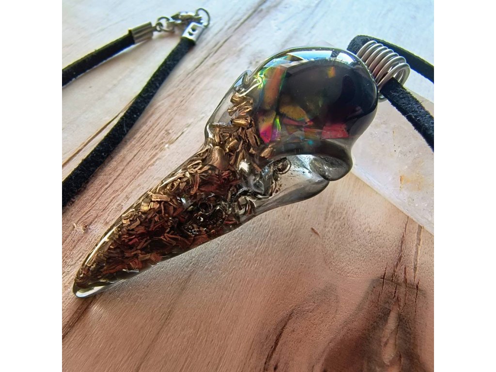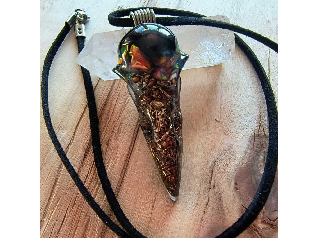 Amulet pro muže, který hledá sílu, chladnou hlavu a nekompromisní ochranu. Orgonit ve tvaru detailní havraní lebky spojuje surovou energii kovů (bronz, měď) a mocných kamenů. Černý obsidián se železitou slídou fungují jako osobní štít proti stresu, manipulaci a elektrosmogu. Zavěšeno na koženém řemínku s ručně vinutým nerezovým očkem. Poctivá ruční výroba z Jižních Čech.