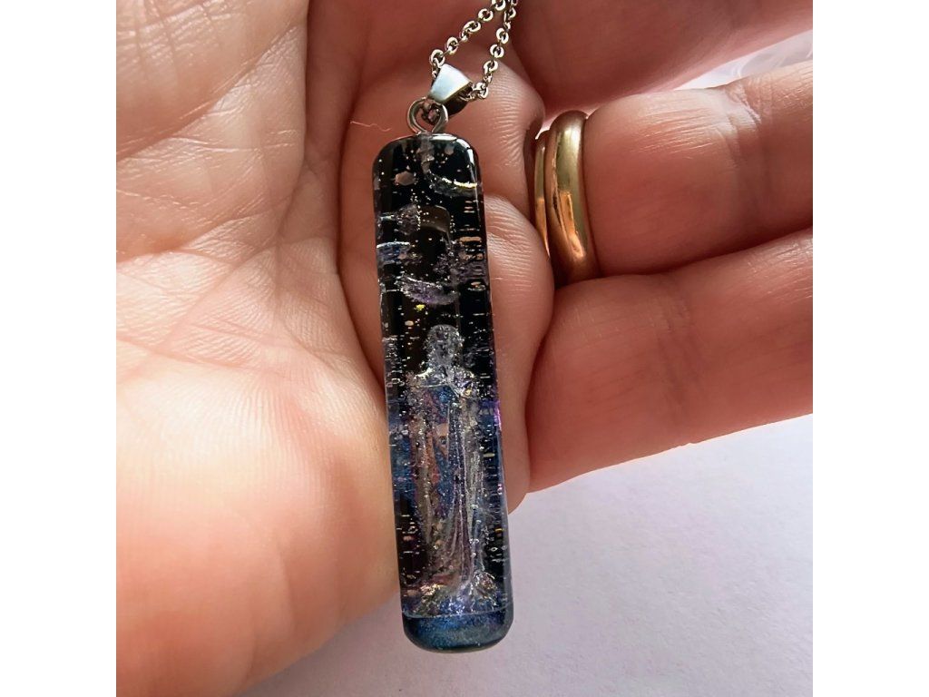 Mějte svého anděla stále při sobě. Tento unikátní přívěsek v sobě ukrývá detailní sošku Anděla, která se vznáší v temném, jemně třpytivém prostoru. Díky speciální technice vrstvení a finální povrchové úpravě má šperk vysoký lesk a fascinující hloubku. Dodáváno kompletně s řetízkem z chirurgické oceli, takže šperk můžete ihned nosit. Česká ruční výroba – OrgoArt.